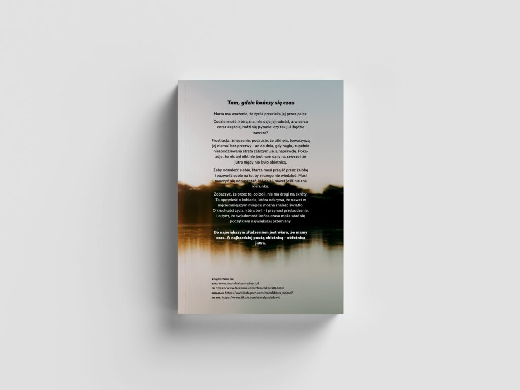 Tak jak zwykle – moich książek, w tym tej najnowszej, nie znajdziecie w księgarniach. Wynika to z przyjętego przeze mnie modelu wydawniczego. “Tam, gdzie kończy się czas” – czeka już na Was w sklepie. Jestem pewna, że dostarczy wiele nadziei i wzruszeń!