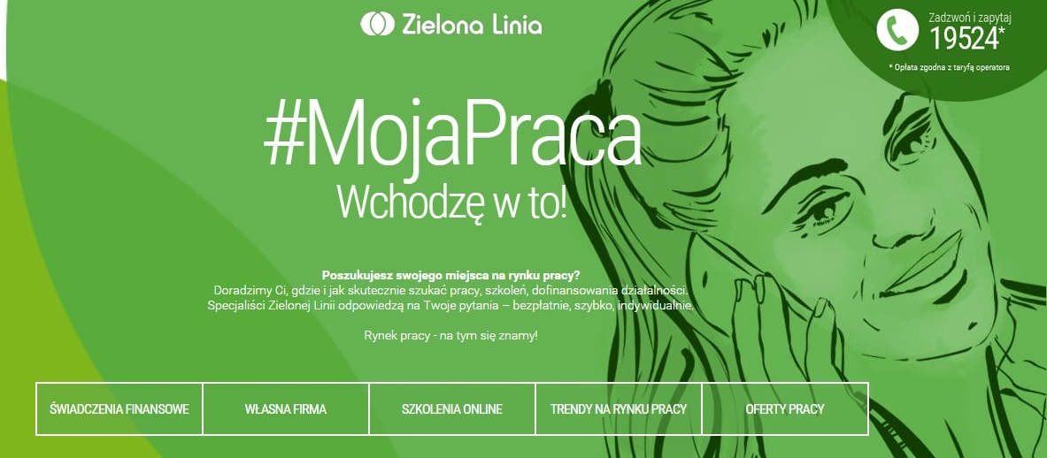 | Zielona Linia to wiele ciekawych opcji pomocy: szkolenia on line, oferty pracy, pomoc w tworzeniu aplikacji |