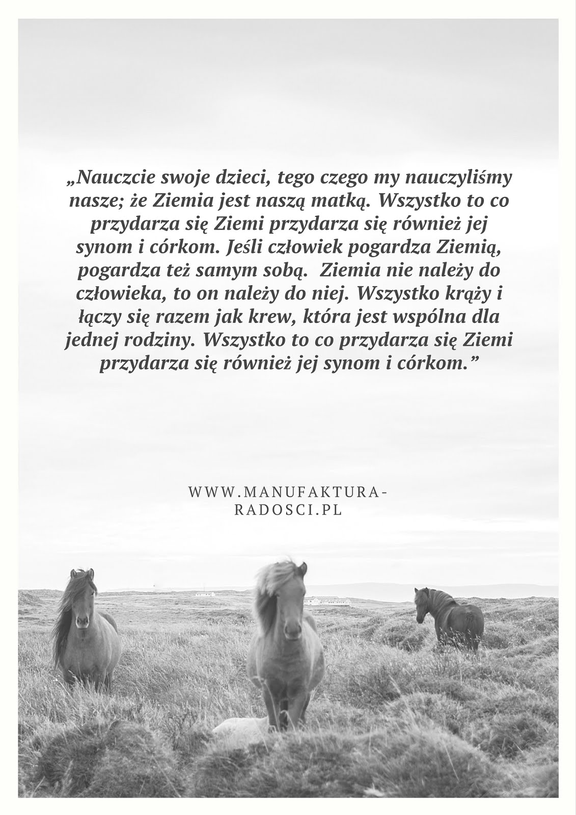 „Nauczcie swoje dzieci, tego czego my nauczyliśmy nasze; że Ziemia jest naszą matką. Wszystko to co przydarza się Ziemi przydarza się również jej synom i córkom. Jeśli człowiek pogardza Ziemią, pogardza też samym sobą. Ziemia nie należy do człowieka, to on należy do niej. Wszystko krąży i łączy się razem jak krew, która jest wspólna dla jednej rodziny. Wszystko to co przydarza się Ziemi przydarza się również jej synom i córkom.”